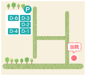 病院脇の路地を入って1本目を左折、突き当たりを右折すると駐車場があります。D-1、2、4、6が当院の駐車スペースです。